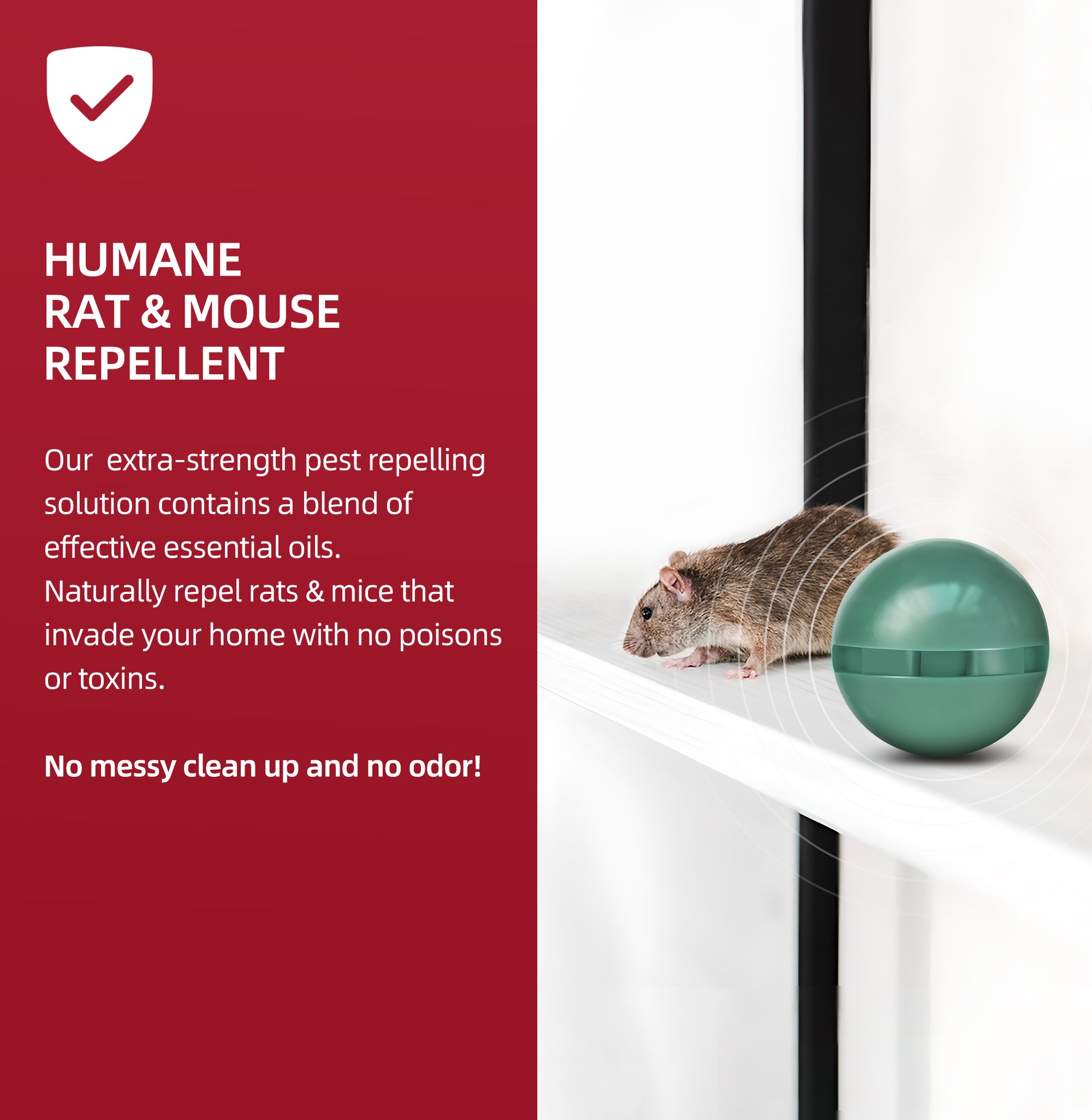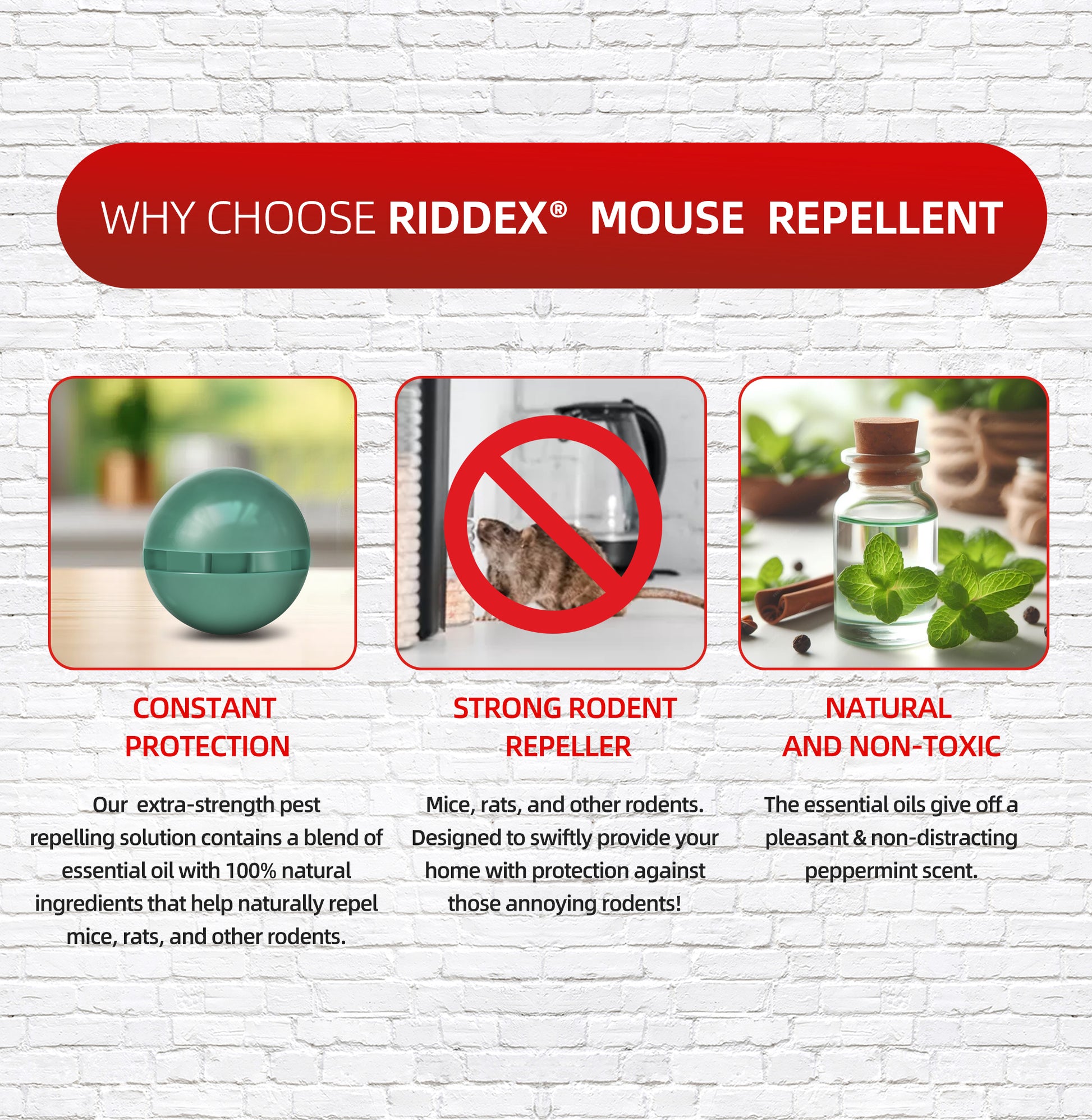 Riddex® Home Free Rat & Mouse Repellent features 6 plant-based scent spheres with hanging sachets designed to reduce rodent presence in enclosed spaces such as pantries, garages, and basements. Made from a natural blend of essential oils, its scent is enjoyable for humans but repels rodents effectively. The convenient twist-to-activate design requires no sprays, traps, or plugs, perfect for use indoors, in vehicles, and in protected outdoor areas. Each sphere provides up to 60 days of scent coverage, protecting up to 200 sq. ft.—combine multiple units for larger spaces. Its non-toxic formula is safe for homes with children and pets when used as directed. Store unused spheres in a cool, dry place.